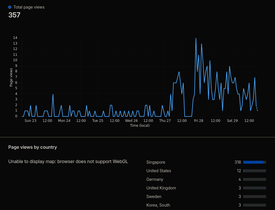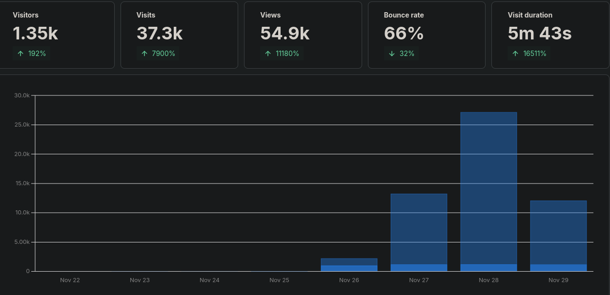 Cloudflare web statistics and Umami are currently giving widely differing numbers which makes me believe Cloudflare sees most of this traffic are bots.